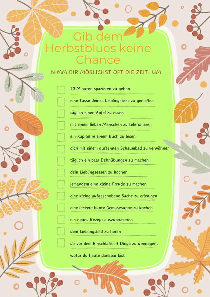 Drucke dir diese Liste aus und hänge sie dir gut sichtbar z.B. an den Kühlschrank, oder einen anderen Platz, wo du sie immer im Blick hast.